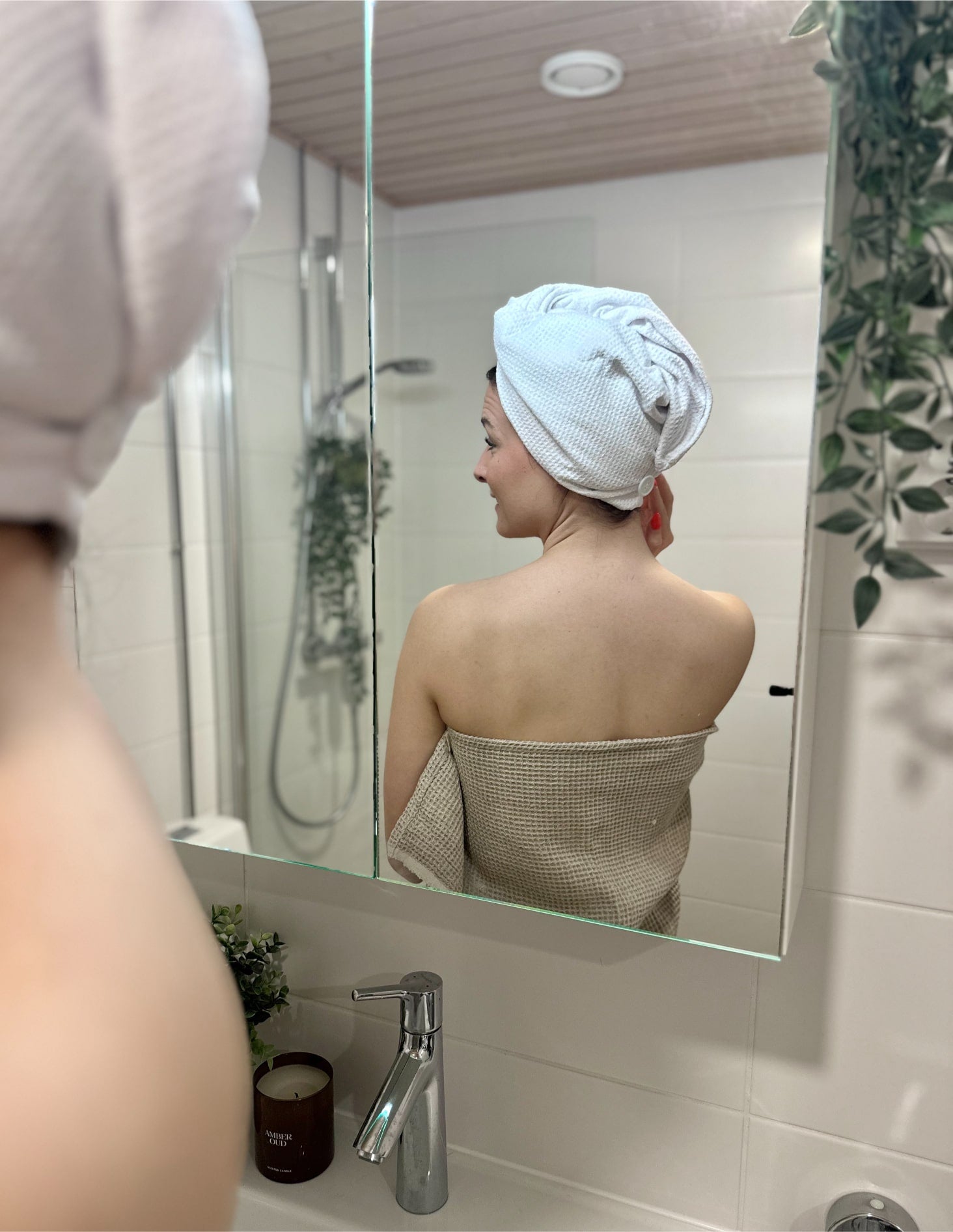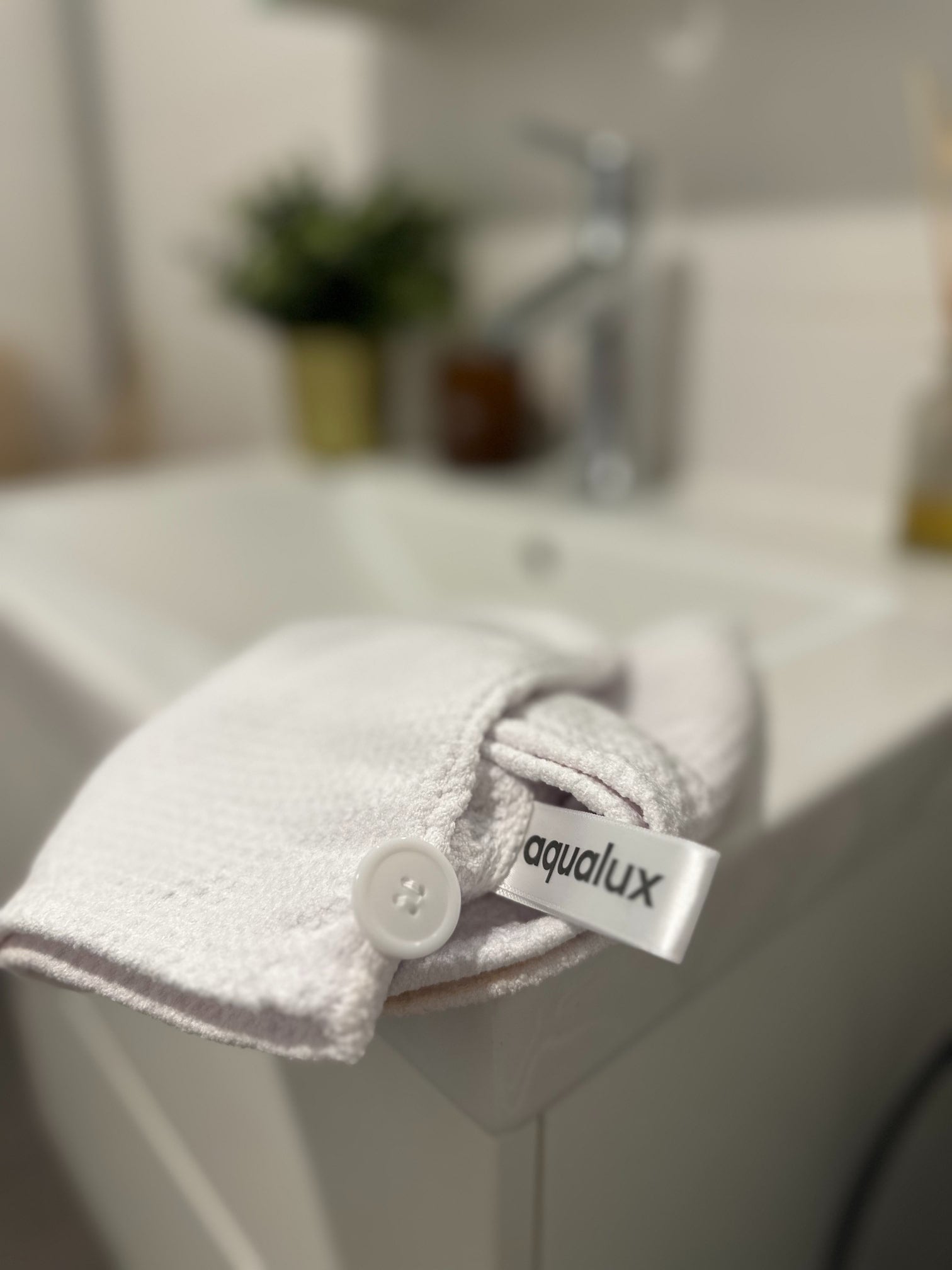 Hiusturbaani toimii täydellisenä parina Aqualux Suihkusuodattimen kanssa — yhdessä ne takaavat hiustesi optimaalisen hyvinvoinnin.